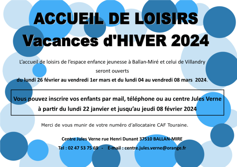 L’accueil de loisirs de l’espace enfance jeunesse à Ballan-Miré est ouvert du lundi 22 décembre au mercredi 24 décembre 2025. Les inscriptions ont lieu du mardi 18 novembre au vendredi 5 décembre par mail : alsh.centre.jules.verne@orange.fr