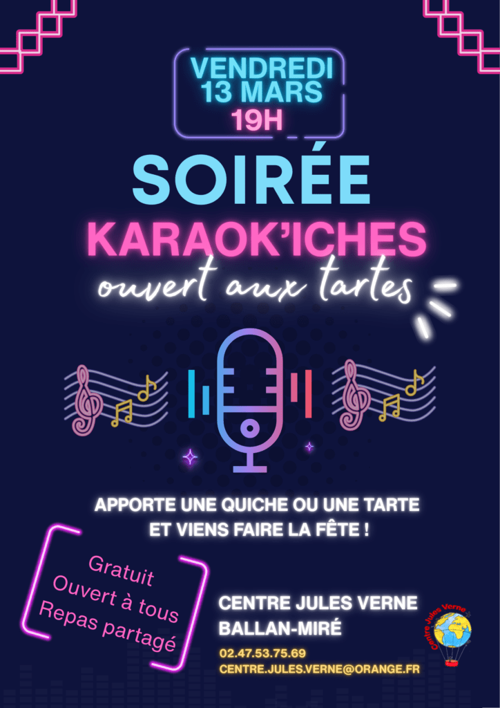 L’équipe du centre Jules Verne vous invite à sa première soirée KARAOK’ICHES (ouvert aux tartes) le vendredi 13 mars à partir de 19h.